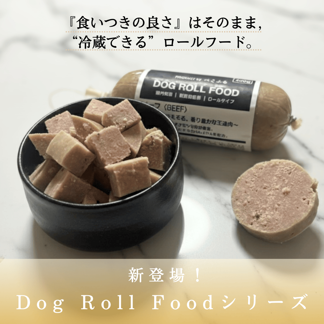 ・ロールフードはソーセージ形状と低温加熱調理による肉本来の食べごたえ、風味、水分量を活かした、海外で主流の、食いつきに定評のある愛犬ごはんです。